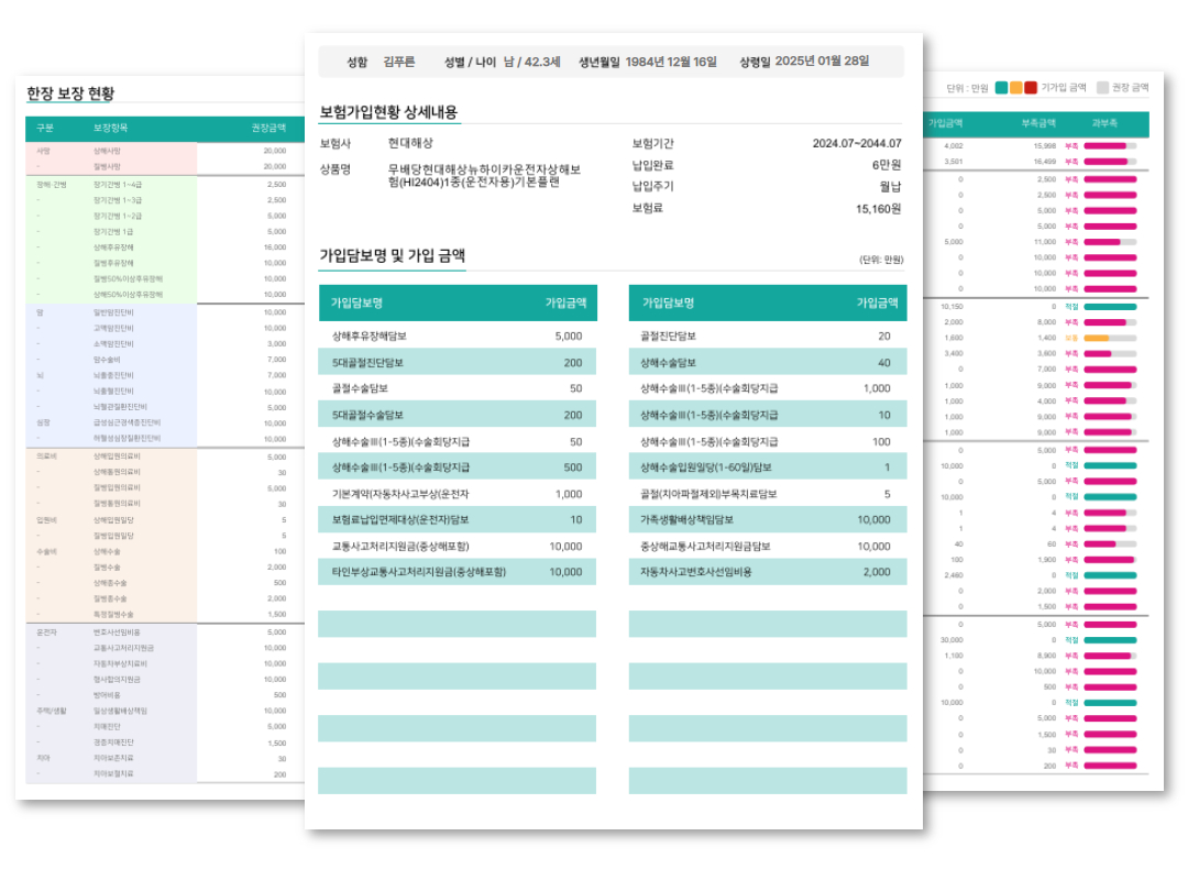 보험금은 적합하게 가입 되어 있는지 보기 쉽게 리포트로 나타냅니다.
